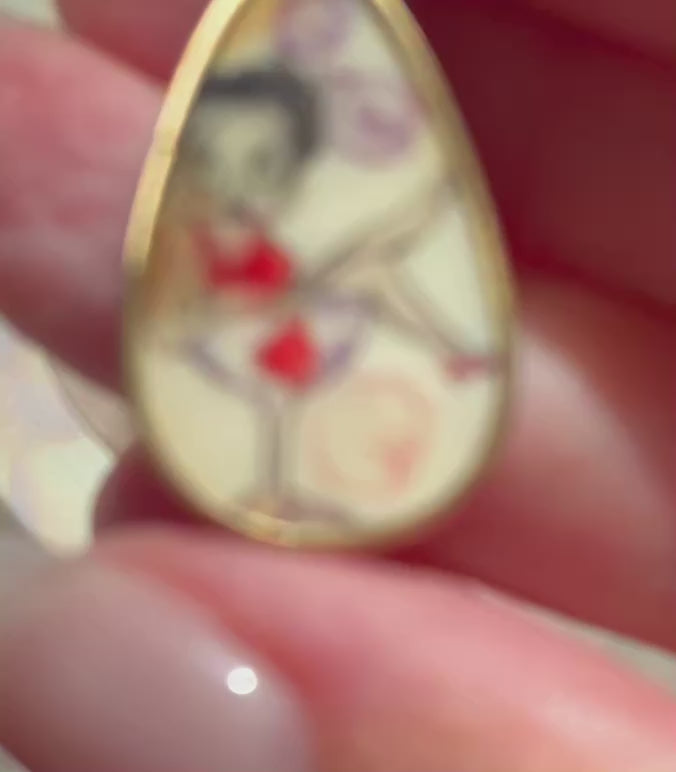 Own a piece of history with this unique hand-engraving of Betty Boop on non-breakable jeweler's glass, made in the 1950's. She is sitting in a cocktail glass with bubbles around her, and the engraving itself is fully encased in a 14k gold wrap around frame.